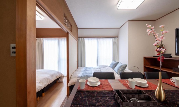 BathroomShower, Bath, Hair Dryer, Toilet, Private bathroom, Slippers, Bath or Shower, Bidet, Towels, Toilet paper, shampoo, conditioner, body soapMedia/TechnologyTV, Flat-screen TV, iPad, Portable WifiGeneralAirconditioning, Clothing Iron, Ironing facilities, Heating, Trash cansKitchenKitchenette, Refrigerator, Microwave, Washing machine, Kitchen, Electric Kettle, Kitchenware, Stove, Cleaning productsBedroomWardrobe/ClosetLayoutwindowRoom AmenitiesTatami |