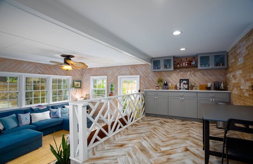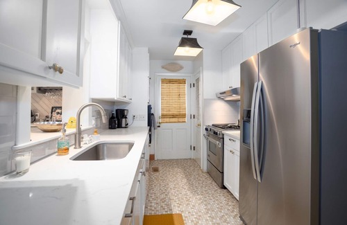 The galley kitchen features two ovens and a gas stovetop—perfect for cooking family meals. Just off the kitchen, a half bathroom leads into a sunny entertaining bar/sunroom area. The dining room seats up to 8 and connects seamlessly to the inviting living space. (Indoor fireplace not available for guest use.) However, the outdoor fireplace is ready for entertaining.