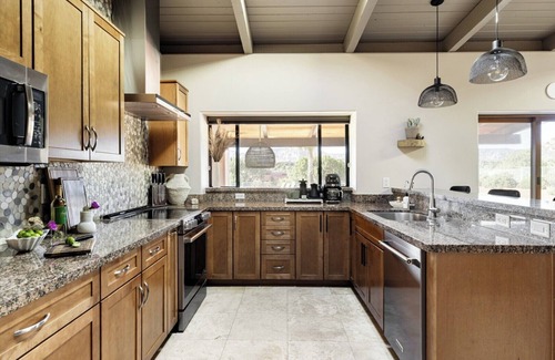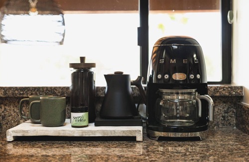 ☀︎The kitchen is a culinary enthusiast's dream, outfitted with high-end appliances and featuring distinctive SMEG coffee maker and tea kettle that add both style and function to your morning ritual. Complimentary tea and coffee are provided. Fully stocked w/ pots, pans. Views of Thunder Mountain out your kitchen windows.