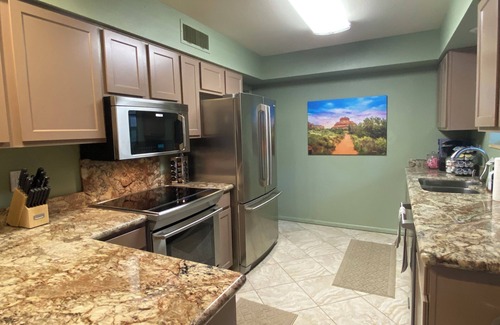 Welcome to our Guest House at Chimney Rock Estate! Clean one bedroom one bath home with warmth and charm borders Oak Creek. This home is on 5 gated aces along with our three other home (main home, pool house and barn loft). Fully upgraded home features newer kitchen with stainless steel appliances with a full size washer and dryer. Pet friendly. Charming features such as a pellet stove, chandelier lighting. Large Smart TVs in both living room and bedroom. Enjoy the Sedona air on the screened breezeway, stroll the beautiful property or walk down to Oak Creek! Enjoy all that Sedona has to offer (just minutes from the sites) and then come back to your private retreat! One bedroom, one bath cabin that truly feels like Sedona!