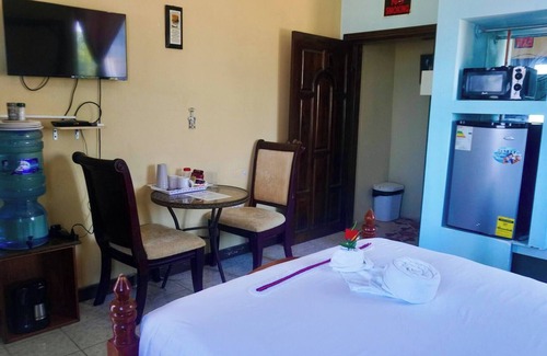 See Belize TRANQUIL Studio is located on the first floor of a lovely 3-storey apartment villa overlooking the Caribbean Sea. It has a split-unit air conditioner, a queen bed, flat-screen tv, mini-fridge, microwave, dining table with chairs, 5-gallon purified water, cable, wifi internet, window, and a private bathroom with a shower/tub combo.
