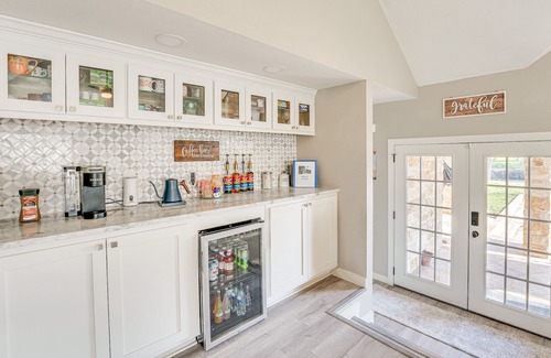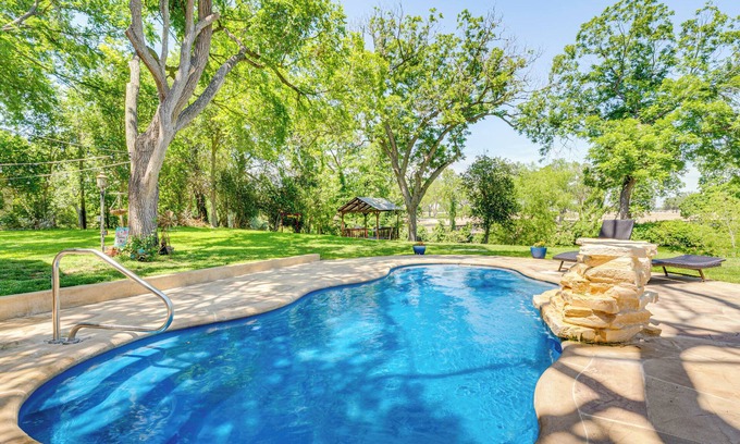 Nestled along the Guadalupe River, this serene vacation rental offers a picturesque escape for large groups in Seguin, TX. This 5-bed, 3.5-bath home features a spacious interior, full kitchen, home gym, and more! Lounge by the pool, cast a line from the fishing dock, or take out a provided kayak on the water! Later, fire up the grill in the outdoor kitchen, enjoy dinner on the patio, or cozy up inside watching the Smart TV.