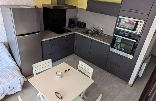 Accommodation: Dive in a bright and comfortable setting for your next vacation. Located on the first and last floor of a small building, this spacious apartment is perfect for up to 5 people.Characteristics of the apartment :User friendly stay: enjoy a space bathed in light with a click-clac, TV, table and chairs, furniture.Fully equipped kitchen: microwave, refrigerator/freezer, induction hob, oven, dishwasher, electric coffee maker.Functional bathroom: shower, sink, toilet, and washing machine.Mezzanine night space: a double bed and two bunk beds, ideal for families. Balcony: equipped with a table, chairs and a blind to enjoy meals outdoors.Private parking: reserved space for your vehicle.Note:Bed linen, towels, end of stay cleaning, high chair and tourist tax are not included in the rental rate.For more information on the natural and technological risks to which this property is exposed, visit www.georisques.gouv.fr.