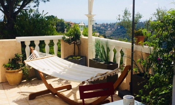 The view from the terrace is magnificent: sea, Cap d'Antibes and the mountains of the Nice hinterland.