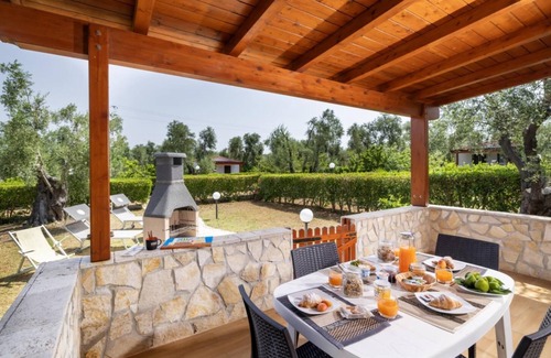 The Villetta, a semi-detached property of 55 m², is designed to accommodate up to 6 guests and offers a wide range of amenities, including a private barbecue for outdoor dining.Located on the ground floor, it features an independent entrance and a private 150 m² garden, complete with sun loungers and a barbecue area. Inside, the Villetta comprises a spacious living room with a fully equipped kitchenette (including kitchenware and utensils) and a sofa bed with two pull-out beds, each fitted with orthopedic mattresses of equal height to those in the bedrooms.The sleeping area includes one double bedroom and one twin bedroom (which can be arranged as a double, if preferred). A private bathroom with a hydro-massage shower ensures additional comfort. The property also boasts a furnished veranda with tables and chairs, perfect for relaxing outdoors.