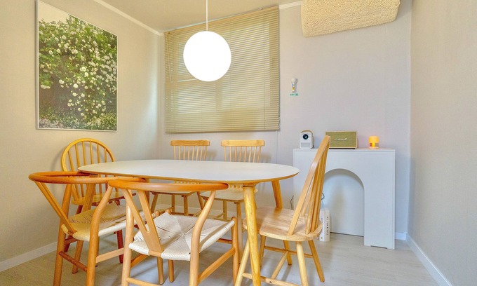 It is a house with beautiful lights to create a cozy interior. Cooking is available and Drip coffee machine is also prepared. It has 4 beds(3 queen size beds and 1 sofa bed), making it perfect for families and gatherings. Recently remodeled, it's neat.