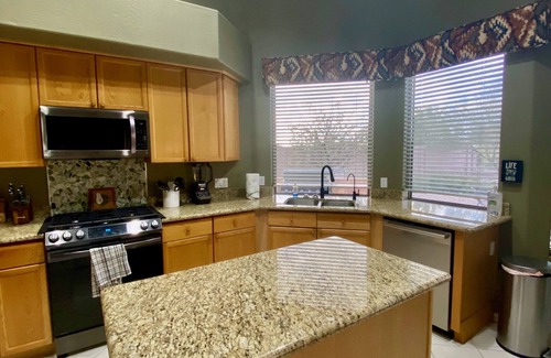 Vacation/Workcation - you choose! Our spacious 3BR/2BR Tatum Ranch Golf Club home has it all! We are close to tons of great restaurants and shopping areas! Also find many popular destination points of the area including nature walks and hiking, golfing, casinos, and of course MLB Spring Training! Phoenix Sky Harbor Airport is just a 30-minute drive, and the famous Mayo Clinic is within 10 miles. This single-story home sits on a very private desert view lot where you can relax with beautiful sunsets from the hot tub, drinks around one of two fire tables, a family movie or sports on the patio TV! Inside the home you will find a spacious open living area with a cozy fireplace and dining for 6, along with a generously equipped kitchen. There's even an office area if you must! Free high-speed internet and Wi-Fi of course. We provide Apple TV in the main living area and each bedroom has a smart TV - feel free to bring your streaming devices!