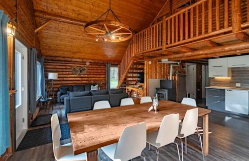 On the ground floor of this log cottage, you will find a large open area on the kitchen, the living room and the dining room. The Scandinavian modern decor and the central fireplace provide a warm and relaxing atmosphere. The kitchen is fully equipped with fridge, stove, dishwasher, microwave and other kitchen accessories. The dining room can accommodate 10 people at the main table and an additional table is at your disposal. The living room is equipped with two sofa. The master bedroom offers you two double beds.