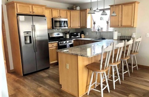 The downstairs has a GAME ROOM with ping pong, foosball, and a dart board. The kitchen is fully stocked with everything you may need to have a wonderful dinner at the dining table that can accommodate six people and there is an additional breakfast bar for eating .