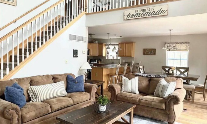 Our three story home is large enough for friends just wanting to get together, yet cozy enough for couples or small families. There are two twin beds and three queen beds spread out over four bedrooms. There are two full baths. Also included are a sleeper sofa and a futon. High speed Wi-fi and Roku are included and the home boasts four televisions.