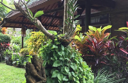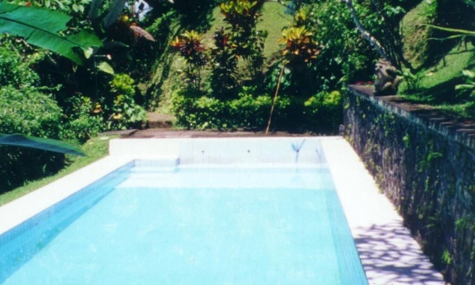 My home is unusual for Bali, with the privacy, the “space,” and the amazing jungle-like atmosphere supplied by our mellow and caring staff. It is a 5 minute walk up the (occasionally steep- ~ 15% grade; not for older folks with walking difficulties) 100 m. “village path” to small restaurants and shops, and a 10-minute walk to the outskirts of Ubud, and 20 minutes to Ubud center/Monkey Forest Road. Melodic birds, frogs and large butterflies abound, but mosquitoes and other bugs are far less than at the beach. The sounds you hear are birds, waterfalls, roosters (mostly in the mornings), and the occasional dog. Traffic noises are non-existent or very muted here. The pool is totally private&pristine with a shallow "sitting bench" perfect for holding & splashing infants, but it is down a 2-level stone path and not “secure” for small children. On the way down to the pool is a gazebo perfect for yoga, painting, meditating, etc. You will find nothing like it nowadays (it was originally built in 1980, when it was possible to get larger parcels of land, and build for open-air, Balinese-style living.) However, it is definitely not a “tourist hotel” with frequent spraying for bugs, and an “enclosed fully A/C environment" (although both downstairs bedroooms are A/C; upstairs suite has a fan...) It has a wonderful patina, artwork all around, a traditional Balinese feel, and is a little "worn around the edges..." It is older, and generally quite clean, but humidity and lack of "...marble all around" makes it not "...hotel clean..." It is probably one of the most secure locations in Bali because of its hidden nature at the end of a 100 m. village path. This is not a “Villa Complex,” but a totally private, secluded property literally just outside of Ubud. As a “Balinese property,” I cannot guarantee the absence of wildlife such as frogs, geckos, roosters, etc: it is a hidden, exquisite, private, well-cared for Balinese estate. There are not many mosquitoes in my area, but beds are protected by mosquito netting, as, although windows are screened, there are very small gaps in doorways, as my home has old style Balinese antique doors throughout, which are not airtight.