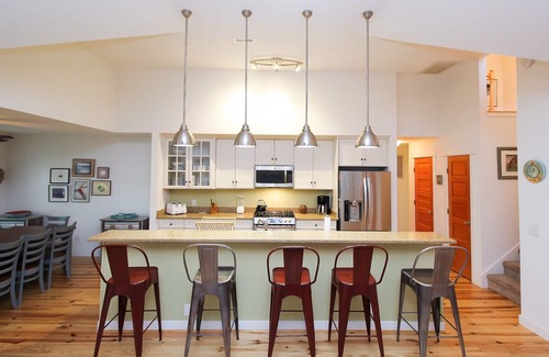 Vacation in a fully renovated cedar shake home , just a stone's throw from the Atlantic Ocean in the Sanderling section of the Outer Banks of North Carolina. Draped by age-old live oaks, this beautifully crafted 2,600 square foot vaulted ceiling house offers two master bedrooms with king beds on the main floor, each with their own full bath. Above, there is a queen bedroom and bunk room with four twins, which share a Jack and Jill bathroom. All bedrooms have flat screen televisions. The beautifully appointed bedrooms are accompanied by a great room with a fireplace, flatscreen television. large dining bar and new dining table for 10, kitchen with Bosch dual-fuel range, double door refrigerator with ample freezer drawer, and a fully equipped gourmet kitchen. On the Albermarle Sound side of the great room is a comfy living room with a flatscreen television and on the ocean side is a bright reading room set apart by solid fir pocket doors for quietude or an afternoon nap. The house has WiFi and toll-free long distance telephones in case cell service is low.