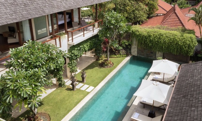 The villa is conveniently situated in Batu Belig, one of the well-known destinations on the island. The villa has a roomy open-plan design in a modern tropical style and was designed by the well-known worldwide architect Fredo Taffin. Set in 930 square meters of lush tropical gardens, this luxurious villa is impressive and opulent. It has a 15-meter swimming pool, a large Jacuzzi with a table for snacks and refreshing drinks, an outdoor dining pavilion with daybeds and a big flat-screen TV, and an imported Australian gas barbeque. The holiday ambience you enjoy at The villa is further enhanced by lush tropical gardens, pools, running water features, and a koi fish lily pond, all of that are enchanting to the eyes. You may keep your serene privacy while still yet being within easy reach of the top-notch dining and entertainment options around you– which are situated in the same street as The villa.