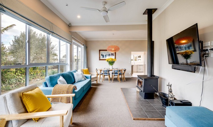 Just as welcoming, the indoor living spaces here at Serenity by the Sea are furnished for style and comfort. Ample windows and doors drench the open-plan living and dining area with sunlight, while a wood burning fireplace and heat pump technology keep it at just the right temperature, no matter the season.