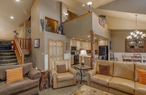 Step inside to a warm and inviting open-concept living area featuring soaring ceilings, a cozy stone fireplace, and large windows that flood the space with natural light. The fully equipped kitchen has everything you need to prepare delicious meals, and the dining area is perfect for gathering after a day of adventure.