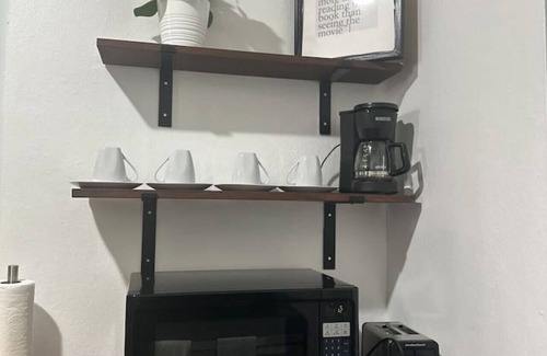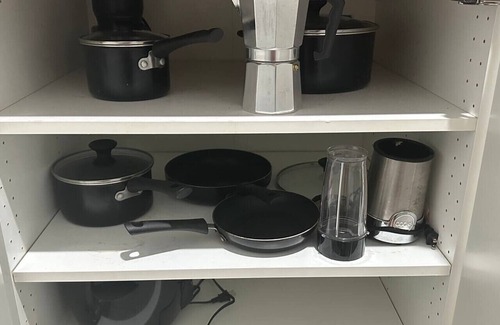 - Una cocina completa con estufa, horno, nevera, platos, tazas, utensilios, cafetera, tostadora, ollas, y sartenes