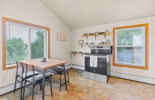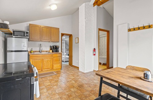 When you first enter your 3rd floor home, you'll walk up stairs to lead you up to your comfortable stay. With the unit being on the 3rd floor, you will need to climb 2 flights of stairs to get to the home. Next, you'll enter an open kitchen and dining area which includes all of your cooking essentials, plenty of plates and glasses for dining and a fully stocked coffee bar. You'll then enter your cozy living room area complete with a fold out couch that can be used as an additional full size bed. Enjoy a large Roku TV with all your favorite apps to catch up on your favorite shows. Then enter your bedroom through stylish french doors and enjoy your luxurious king size bed. Enjoy the unique ceiling window above the bed and a large Roku TV and USB charging ports for your convenience.