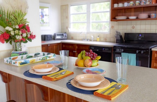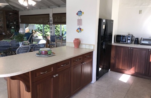 The great room offers a full entertainment area with DVD/Cable TV and stereo as well as an indoor dining area that seats 8. You have the option of enjoying the natural trade winds or air conditioning. The kitchen is spacious and incredibly well equipped with an island between it and the great room encouraging relaxation and conversation.