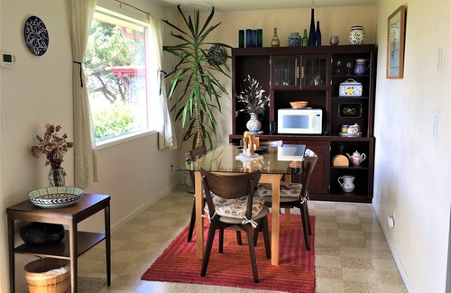 You can see the ocean from the living room and dining room and on a nice day sit out on the deck with a cup of tea, soaking in the rays and listening to the sounds of the pounding ocean. The house is a very comfortable, bright , cheery, well stocked abode that is cozy in all seasons, with warm fluffy blankets and comfortable beds.