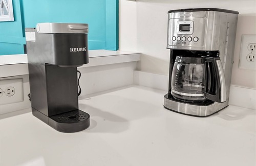 Fully Equipped Kitchen with refrigerator, stove, microwave, coffee maker, and all essentials for preparing meals.