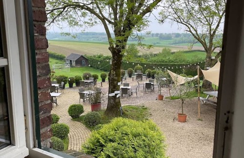 De living grenst direct aan het buitenterras met weids uitzicht over de grote weide die tot het complex behoort en op het Limburgse landschap. Daar is heerlijk genieten van een etentje en een drankje. Ben je met kinderen, dan kunnen die naar hartelust spelen in de weide en kun je ze toch in de gaten houden.