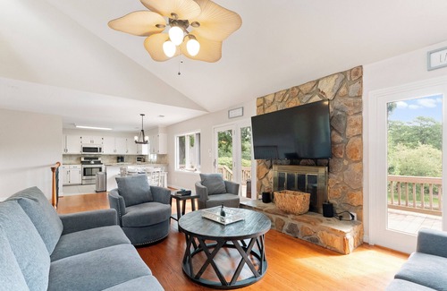 The main level also hosts three bedrooms. The primary bedroom, with a king bed, has sliders to the deck for private lake views and a recently remodeled master bath with a tiled glass shower. The 2 other main-level bedrooms share a full bathroom in the hall. One bedroom boasts a king bed, and the other has a queen. All bedrooms have new wall-mounted TVs!