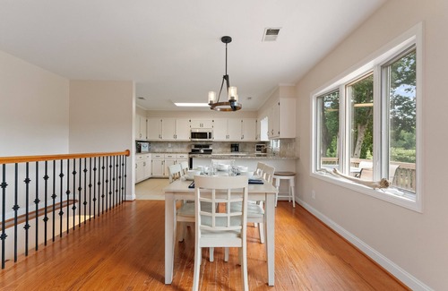 The open floor plan on the main level gives you views of the lake from almost every window. The bright, open fully stocked kitchen has a bar with seating for 4 as well as an eat-in kitchen area open to the main living area. The kitchen offers a Keurig and drip coffee maker giving each guest choices to make their morning Joe! The main level has new furnishings with comfy couches, new large TVs, and sliders to a deck with grill, seating, and Adirondack chairs - perfect spots to relax with morning coffee or an adult beverage!