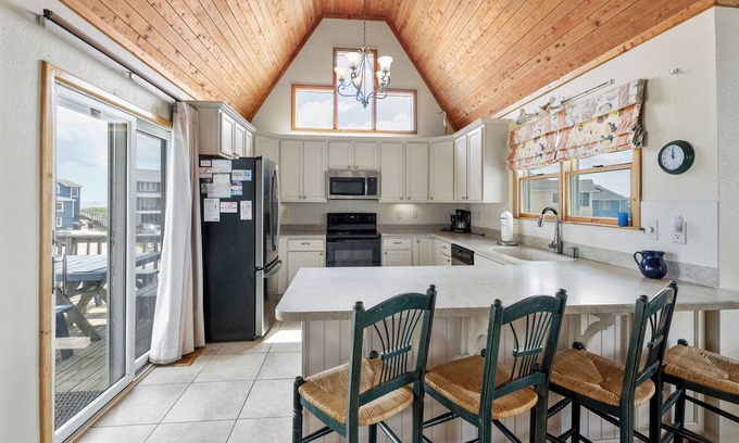 Shannon is a classic Outer Banks cottage situated on a corner lot in the Tuckahoe community of Duck. The semi-oceanfront location offers ocean views and easy access to the beach directly across the street. Vaulted ceilings, LVP flooring and a wall of east-facing windows in the open-concept living/dining area make the space feel bright and airy. When you're not trying out one of Duck's fabulous restaurants, your family can prepare meals at home in the recently updated kitchen with quartz countertops and bar seating for four. The primary bedroom is conveniently adjacent to the great room and includes a queen bed, private bath and deck access. Three additional bedrooms are located on the mid-level, including a second queen ensuite. There's also a den that can serve as an additional hangout space, complete with comfortable seating and TV. Outside, two levels of wraparound decks are perfect for lounging in the sun or relaxing in the shade while listening to the sound of the waves.