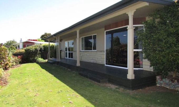 This Taupo holiday home includes open plan living with a gas fire for cosy winter stays... or relax on the deck with peaceful surrounds and lake views! The fully fenced section is a great option for families, with a children's playhouse available and a sheltered BBQ area. Plus, the geothermal pool is on hand for cooler evenings, and is located in a separate pool house.