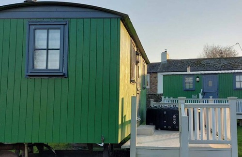 Surrounded by apple trees the 4 shepherd huts are accessed via a wooden staircase. Small and cosy but fully equipped to enjoy a relaxing break they each have a wood burning stove making them cosy all year round, a Belfast sink, fridge and micro oven/hob. There is a pull out dining table with seating and a comfy double bed with a bunk single bed above. There is also an en-suite shower room for added convenience.