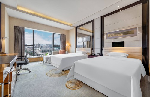 Sheraton Zhongshan Hotel offers 362 air-conditioned accommodations, which are accessible via exterior corridors and feature minibars (stocked with some free items) and laptop-compatible safes. Beds feature premium bedding. A pillow menu is available. LCD televisions come with satellite channels. Guests can make use of the in-room refrigerators and coffee/tea makers. Bathrooms include separate bathtubs and showers with deep soaking bathtubs and rainfall showerheads. Bathrooms are also outfitted with bathrobes, slippers, and complimentary toiletries.