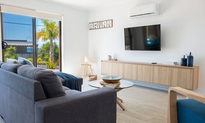 A peaceful, luxurious and spacious villa. Two bedrooms, ground floor and fully self-contained with sea views. 1 Queen bed and 2 singles. Full kitchen, dining, lounge, bathroom, quality linen, Air-Con. Included WiFi, parking for 1 car at the door, heated indoor swimming pool. Fully equipped kitchen with full stove and fridge, microwave, dining table, spacious lounge with smart TV, large shower, linen & heating/air con. A five minute walk to the beach!