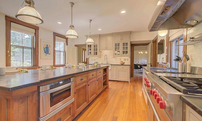 Step inside and be greeted by a meticulously curated interior meant to give a modern nod to the home's past. Gather with family in the two adjoining living rooms. Enjoy the well appointed kitchen where you can gather around the island for cocktails, or sit at the dining room to enjoy a family meal. Spend leisurely mornings savoring breakfast and coffee on your private brick patio, surrounded by lush greenery. Even on rainy days, indulge in relaxation within the inviting confines of the finished basement, equipped with board games and streaming TV for endless entertainment.