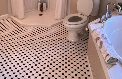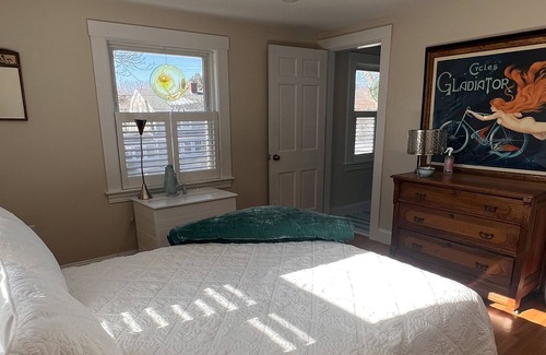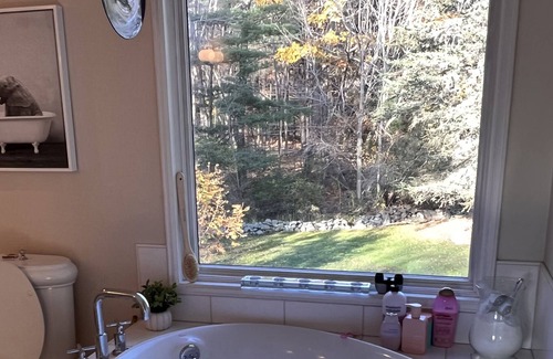 Enjoy the artistic simplicity and the smell of sea air throughout this mid-century house. Hardwood and tile floors make this a rough and tumble space perfect for couples and families. The kitchen boasts a 17 ' black granite island, perfect for grabbing meals around beaching it. A "Morning Room" with a cornflower blue linen sofa suits the afternoon napper just fine and a second sunny living room with plenty of seating for an afternoon cocktail or evening movie-time. Look around and see little artistic surprises everywhere including a Nautical Figurehead and featuring New England artists. See if you can name them. Moving upstairs, the bedrooms are minimal in a blend of off-white and white offering the warmth of a family home with plenty of fresh linens and towels for everyone. The upstairs full bathroom has a neo-angle shower and a giant jacuzzi garden tub with a picture window overlooking the large backyard, stone wall and into the surrounding forest. Classic black and white tile flooring offers a hotel touch. A small sitting area at the top landing provides a waiting area for the early dresser for the night's dinner out. Two Queen bedrooms overlook the beach road and a back bedroom with two twin beds has stocked bookcases for beach readers and a view of the yard. Pack up and take a short walk to spend the day at "Pirates Cove" Beach (aka Rye Town Beach). While the neighborhood is quiet, you're bound to see beach-goers making their way on mopeds, bicycles or skateboards. Feel free to adorn your rooms with fresh-cut flowers from a 50' Perennial Garden. Later, enjoy a cocktail or dinner on the deck using the nearly new Weber Grill. Or hit up any of the great Seafood Restaurants close by. Come “home” and shoot the breeze outside around an evening fire under the stars in the ample back yard. Simple fun. For a great pub crawl, dancing or fine dining check out the plethora of choices in Portsmouth just a short drive into this charming tourist town. Enjoy this amazing year-long celebration of 400 Years of Portsmouth, New Hampshire. Deep monthly discounts in the off-season.