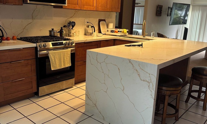 The rental comes with a brand new kitchen with a very open design and lovely countertop to enjoy meal prep and dining. The large teak table is next to the kitchen as well as the living room with so much room. It is truly a great room with sliding glass doors inviting the outside greenery.