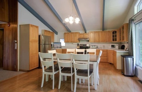 There are a total of 4 bedrooms, 10 beds, and 3 bathrooms! Amenities include a Large TV with cable, high speed wireless internet, patio with BBQ, wood burning fireplace, wood burning stove, foosball table in game room, + more!