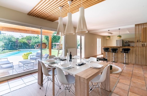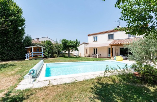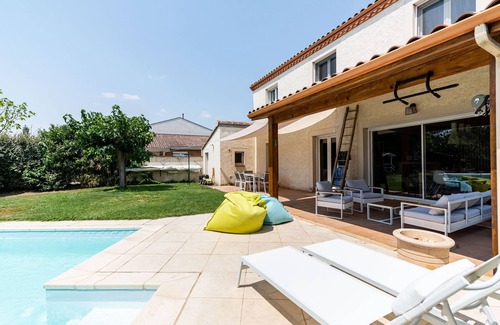We propose to you to the rent, on the commune of Toulouse, in 100 m of the big park nature of the ramée and its lakes, this charming house with swimming pool, of a surface of 170 m ² and being able to accomodate until 8 travelers. It is composed of a nice living room of 70 m², an open fully equipped kitchen, four beautiful bedrooms, an office, three bathrooms and you can enjoy a garden of about 800 m². Wifi (optical fiber), sheets and towels included, we are waiting for you!