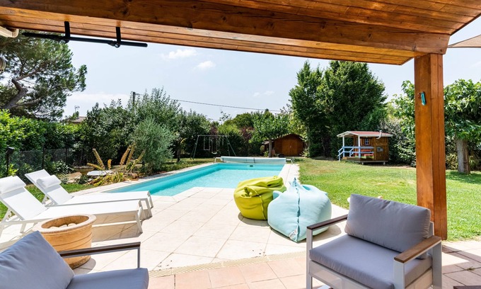 For even more comfort, the owners have decided to invest in the following additional equipment: a playhouse for the children, a swing with trapeze and rings as well as the pool house, barbecue, washing machine, ironing board and iron (the laundry equipment is in the house).