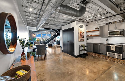 Stay in the heart of Waco at this two-story urban-industrial loft in the historic Behrens Building. Featuring a spacious living area, fully equipped kitchen, automated blinds, and luxurious sleeping options—including a king-size bed and premium sleeper sofas—this suite offers modern comfort with industrial charm. Enjoy stunning views of The Silos and Baylor University, all just steps from Magnolia Silos, the Dr Pepper Museum, and other top Waco attractions.