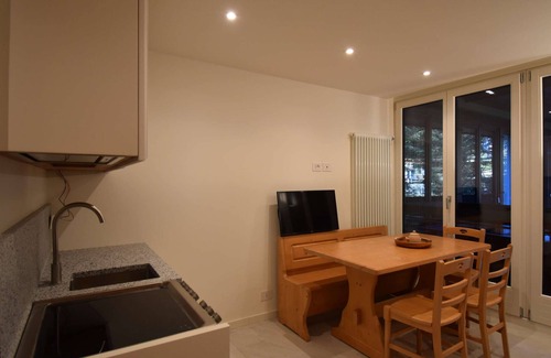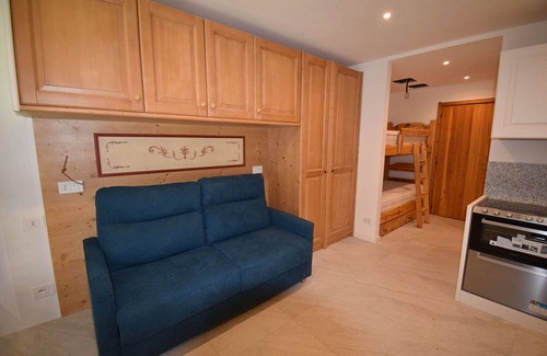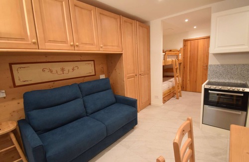 Renovated studio apartment with 4 beds, consisting of an entrance with bunk beds, a bathroom with a shower, a living room with a double sofa bed, a kitchenette and a dining table with a bench, and large windows. It is in excellent condition. Excellent location just a few steps from the Spinale cable car and the ski slopes of the Campiglio Dolomiti di Brenta ski area, also very convenient for the centre of Madonna di Campiglio and all the services and venues in the town.