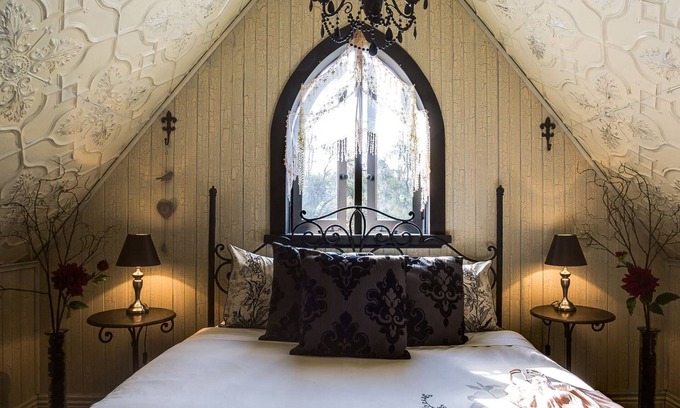 Enter through the tiny french doors into this gorgeous little slate roofed / board & batten cottage for two and you will find a sweet cast iron spiral staircase that winds up to a romantic sleeping loft with antique QS bed, luxury linen and pressed metal ceilings illuminated by chandeliers. Enjoy views through the arched window over tea trees that transform each evening with soft lighting from below.