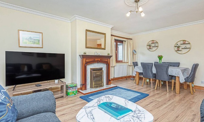 This spacious lounge boasts a comfortable corner sofa, two armchairs, coffee table, 55in Smart TV with a DVD player and Freeview. The traditional inset gas fire, provides extra warmth if needed. There is a selection of DVDs available next to the DVD player. There is a dining table with 6 chairs.