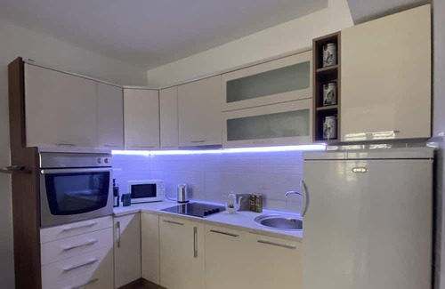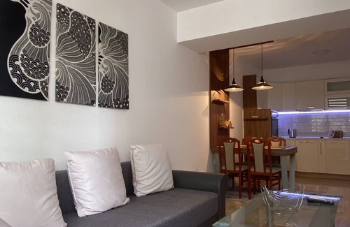 The apartment is located in the heart of the Aerodrom Municipality, only 2 kilometers from the Macedonia Square in the Center of the city. It has modern design, with the finest furniture and a new kitchen, equipped with a microwave, water heater, juice blender and everything from glasses to cutlery. It is on the 4th floor of a newly opened building that has an elevator. This is the first rental season of the apartment, hence we would be pleased to welcome you as our first guests!