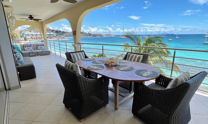 ENJOY THE BREATHTAKING OCEAN VIEWS OF MEGA YACHTS, SAILBOATS, WATER ACTIVITIES AND BEACH FROM YOUR DOUBLE WIDE TERRACE with comfy elegant outdoor furnishings. New jumbo GENERATOR (2024) for power outages plus new satellite internet that is the best!.