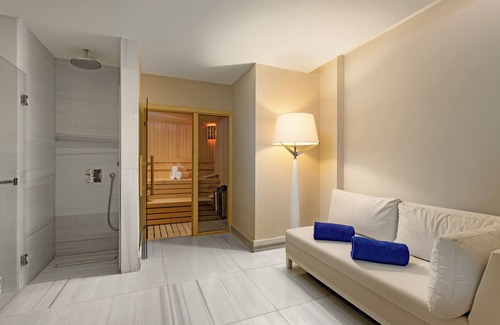 An indoor pool, a children's pool, and a seasonal outdoor pool are on site. Other recreational amenities include a private beach, a sauna, and a fitness center.