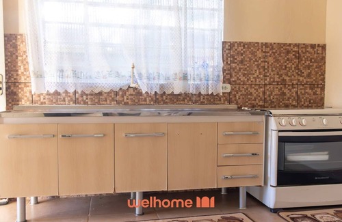 O banheiro é equipado com chuveiro, armário, acessibilidade e água quente. Há dois banheiros no total. A área de serviço dispõe de tanque, varal, ferro de passar, tábua e máquina de lavar.