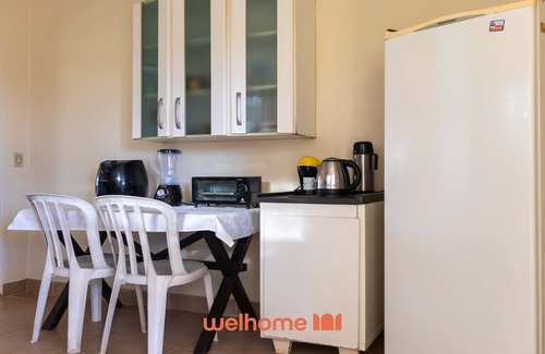A cozinha é completa e equipada com fogão, forno, micro-ondas, airfryer, geladeira, freezer, cafeteira, chaleira elétrica, liquidificador, armários, louça, panelas, talheres, sanduicheira, taças de vinho, panos de prato, utensílios básicos e mesa com cadeiras para as refeições.