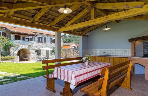 Situated in the charming countryside of central Istria, perfect family vacation. Villa Sany is renovated this year for rent. All rooms are located on first floor of this beatiful holiday house. The villa consist of kitchen with all appliances, living room with sofa and three bedrooms with double beds. Each bedrooms has its own bathroom with shower. There is also one separate toilet. In the outside is a large ( 2000 m2 ) fenced garden with a swimming pool, garden furniture and a covered terrace with a table for up to 8 people. In one part of nice cultivated garden there is a summer kitchen with grill and sitting garniture. Villa Sany is fully air-conditioned and offers parking for 3 cars. If you are planning a relaxing holiday in luxury, this is the place to go. Your host is a physician, physical medicine and rehabilitation specialist, if you have neck, back, hip, knee, or other problems with your movement system, Your host can advise you on how to alleviate your problems, refer you properly doing exercises on the bed / floor as well as in the pool, thus improving your health during your vacation in this beautiful villa..