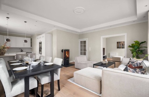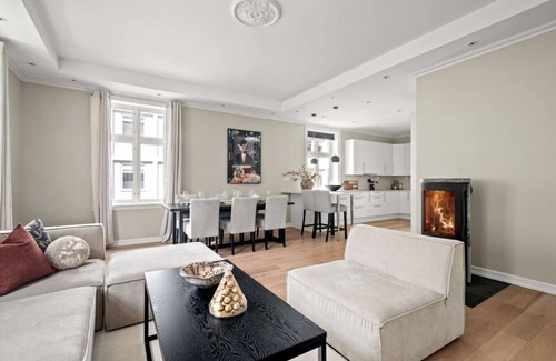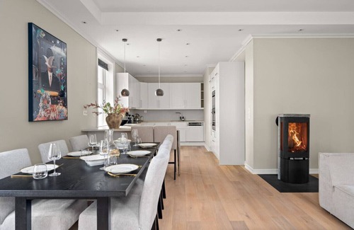 Welcome to pure Scandinavian luxury, perfectly located in what's known as the finest street in the city - Fosswinckels gate. The apartment has two elegant bedrooms, a cozy TV lounge with a sofa bed, and an elegant and generous living and dining area. This home blends the Scandinvian design with luxurious comfort. High ceilings, a fireplace and premium finishes throughout makes it the ideal city retreat for families or friend groups traveling to Bergen.