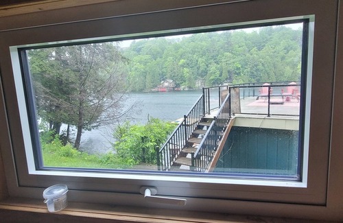 At the shore there is a single slip boathouse with large deck, glass railing and muskoka chairs. Do not lean on the railing especially the gate which must be carefully opened and closed by gently lifting. There is also a floating dock to swim out to. Electric sauna with separate change room.